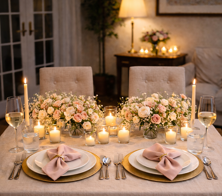 A romantic, personalized dinner setup designed to create a beautiful, intimate atmosphere — styled around your color palette, occasion, or your partner’s favorite aesthetic.